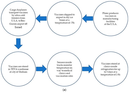 From the SLE warehouse at Shoham, the vaccines were packaged and transported under strict temperature monitoring to hospitals, clinics, and designated immunization centers around the country. Each truck’s temperature was monitored by sensors from a control center to ensure the vaccines were under supervision, as Israel has advanced Internet-of-Things technology as a startup nation []. To illustrate the rapid distribution process, by the end of 2020, the State of Israel, with a population of 9.3 million, delivered more COVID-19 vaccine doses than all other countries aside from China, the US, and the UK. Moreover, Israel had administered almost 11.0 doses per 100-person populations, while the next highest rates were 3.5 (in Bahrain) and 1.4 (in the United Kingdom). All other countries had administered less than 1 dose per 100-person populations [].