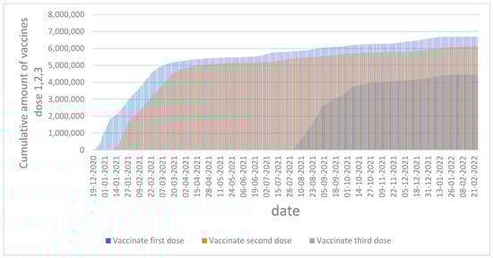 Figure 2 illustrates the number of people vaccinated by doses 1, 2, and 3 over time. From the graph, an insight emerges that while the first and second doses were in high demand, with over six million does, the third dose was less acceptable among the population, with less than five million inoculations.