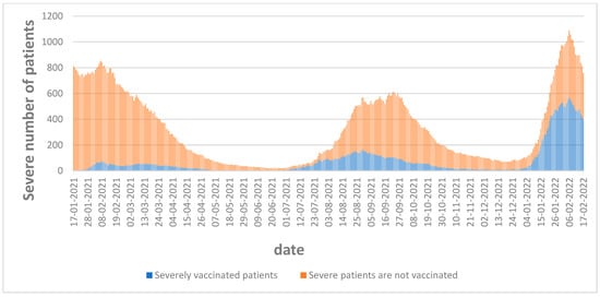 Figure 6 illustrates the percentage of people who tested positively. Based on the graph, the number of people who tested positively was reduced following administration of the first and second doses during the wave in the beginning of the year 2021. Similarly, the booster was able to diminish the number of people who tested positively during the wave towards end of year 2021. The ability of the booster to reduce the amount of severely ill patients during the wave that began on 11 July 2021 is illustrated. The same pattern is evident in Figure 7, which shows the amount of new daily cases.