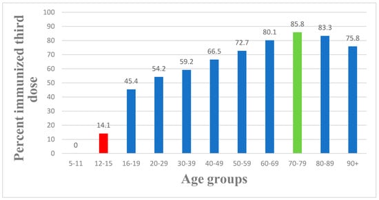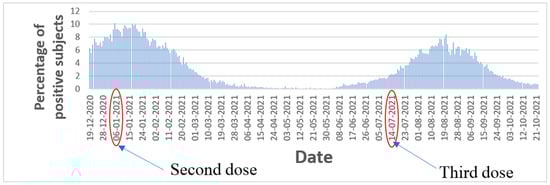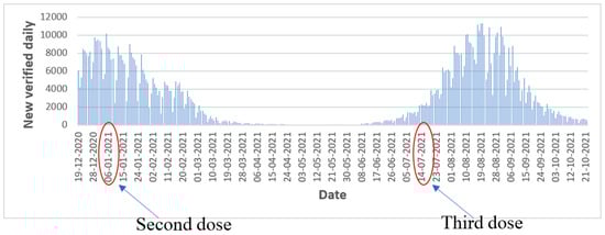Insightfully, Figure 4 also corroborates how the third dose (booster) of the COVID-19 vaccine was able to diminish a wave of COVID-19 (the delta variant) which started in Israel on 11 July 2021. These results are consistent with the findings of Muhsen et al. [] from nursing homes.