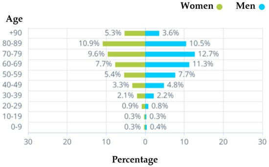 Figure 8 juxtaposes the demographics of the severely ill patients by age and gender. An important insight that emerges is that the percentage of severely ill men is significantly higher (more than 30%) compared to severely ill women across the following age clusters: 40–49 (women 3.3% vs. men 4.8%), 50–59 (women 5.4% vs. men 7.7%), 60–69 (women 7.7% vs. men 11.3%), and 70–79 (women 9.6% vs. men 12.7%). This result is consistent with numerous studies worldwide which have found that men are at higher risk of becoming severely sick and developing life-threatening complications compared to women []. In terms of age, younger age clusters such as 20–29 and 30–39 were significantly less likely to become severely ill compared with people above age of 40, which is consistent with previous worldwide studies []. Specifically, according to Figure 8, the cumulative percentage of severely ill people in the age cluster 0–39 is 7.3%, whereas the aggregate percentage of severely ill people above age 40 is 92.7%.
