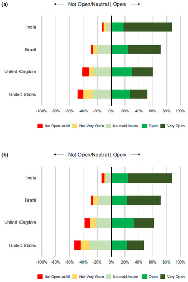 Among the 2010 respondents, 67.4% were “Very Open” or “Open”, 19.5% were “Neutral/Unsure”, and 13.1% were “Not Very Open” or “Not Open at All” to receiving a COVID-19 vaccine. Among the 69% of participants who were pregnant at the time of the survey, 72.2% were “Very Open” or “Open”, 16.6% were “Neutral/Unsure”, and 11.2% were “Not Very Open” or “Not Open at All” to receiving a COVID-19 vaccine. Among the 31% of participants who were postpartum, 56.8% were “Very Open” or “Open”, 26.0% were “Neutral/Unsure”, and 17.3% were “Not Very Open” or “Not Open at All” to receiving a COVID-19 vaccine. As summarized in Figure 1a, vaccine openness (responses of “Very Open” or “Open”) varied widely across the respondents in the four countries: 51.8% in the US, 59.2% in the UK, 71.2% in Brazil, and 87.1% in India.