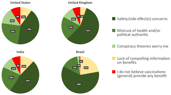 Across all countries, of the 32.6% of participants who responded “Neutral/Unsure”, “Not Very Open”, or “Not Open at All” to receiving a vaccine, the most common reason cited was “Safety/side effect concerns” (51.3%), followed by “Mistrust of health/political authorities” (21.1%), “Lack of compelling information on benefits” (11.5%), “Conspiracy theories worry me” (9.9%), and “I do not believe vaccinations (general) provide any benefit” (6.3%). “Safety/side effect concerns” was also the most common reason cited in each of the four countries (Figure 2).