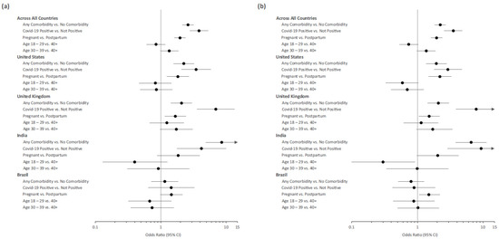 Univariate (unadjusted) Odds Ratio (95% CI) by country and across countries for potential prognostic factors for openness to oneself (a) and one’s children/other family members (b) receiving a COVID-19 vaccine (vs. Neutral/Unsure and Not Open) among pregnant and postpartum women. Odds ratios greater than one indicate that the respondents in the comparison group were more open than the reference group to vaccine acceptability.