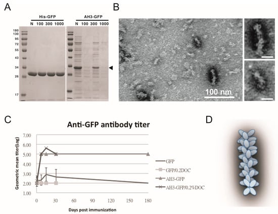To test the hypothesis that AH3–GFP or AH5–GFP fusion protein forms a protein complex, we first used protein concentration tubes with a different molecular weight cut off (MWCO) to determine the protein complex sizes. As shown in Figure 1A, GFP protein with a molecular weight of 27 kDa was able to pass through membranes with MWCO of 100 kDa, 300 kDa, and 1000 kDa freely, but AH3–GFP fusion protein was prevented from passing through the membranes with an MWCO up to 1000 kDa. With a molecular weight of 30 kDa, the purified AH3–GFP fusion protein needs to form a complex with more than 35 monomers to be excluded from passing a membrane with a 1000 kDa MWCO. To further explore the geometric composition of the AH3–GFP protein complex, we examined the fusion protein under a transmissive electronic microscope (TEM). The TEM images showed the AH3–GFP fusion protein forms a corn-on-a-cob structure with a length up to 60 nm and a diameter around 10 nm (Figure 1B). The difference in length suggests that the particle may be assembled along the long axis. When scanning the AH3–GFP particles along their long axis, there is a repetitive pattern of the two-three–two-three array of white dots. The predicted structure, according to TEM images, is shown in Figure 1D. We also examined the AH5–GFP protein complex under TEM, but there was no clear evidence of the formation of a higher-order protein complex, suggesting the AH5–GFP protein complex is not as stable as AH3–GFP to withstand the conditions during negative staining. To find the correlation between protein complex formation and antigenicity, we immunized mice with purified AH3–GFP fusion proteins and the GFP proteins. Proteins were prepared from LPS synthesis defective E. coli strain, ClearColi BL21(DE3), to avoid the interference of LPS contamination, a known TLR4 ligand and an adjuvant. The mice were immunized with purified proteins by single intramuscular injection, and sera were collected at day 7, 14, 30, and 182 to evaluate anti-GFP IgG titer by ELISA. Deoxycholate was added to test if it affect in the concentration of 0.2% affects AH3–GFP antigenicity and the related experiment was terminated at 30 days post immunization when it showed no effect on the antigenicity of either GFP or AH3–GFP. These results suggested GFP alone is a poor antigen and it only gains high antigenicity after being fused with the AH3 peptide (Figure 1C).