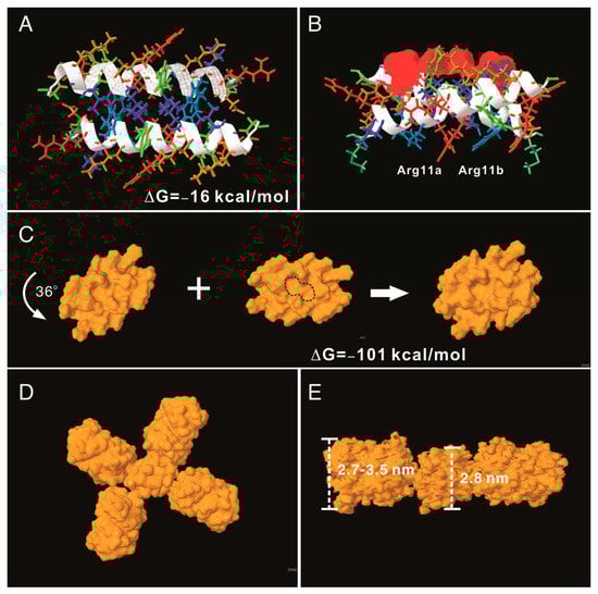 To understand the potential molecular mechanism leading to the assembly of the AH3–GFP nanoparticle, we built an AH3 model based on a known helical structure and the hypothesis that hydrophobic interaction drives the complex formation in addition to two observations from TEM images: first, the particle was assembled along the long axis and second, the AH3–GFP protein particle had a repetitive three-two pattern along its long axis after examining the protein particle images. We first assembled two AH3 peptides as anti-parallel helices with a 24-degree angle to make close contacts involving side chains of Phe5, Phe6, Ile9, Leu13, and Leu17 using protein modeling software, AscalaphDesigner (Figure 2A). The hydrophobic core contributes the major intermolecular force binding these two helices and the AH3 dimer is surrounded by hydrophilic side chains from multiple lysine and arginine. Using another protein modeling software, Deepview, a hydrophobic patch was identified on one face of the assembled dimer as marked by a red surface (Figure 2B). In a water-accessible surface model of the AH3 dimer, two connected hydrophobic pockets can be seen located within the hydrophobic patch (marked by a dashed line) that serve as binding sites for two Arg12 side chains extruding from the opposite face of the second AH3 dimer. After turning counter clockwise for 36° while looking down the hydrophobic patch, the second AH3 dimer made close contact in tandem with the first dimer and formed a tetramer (Figure 2C). The intermolecular energy between two dimers from this model was calculated to have a ΔG of −101 kcal/mol (Figure 2C). After adding GFP protein structures onto the AH3 tetramer model, the AH3–GFP fusion protein tetramer formed a scissor-shaped assembling unit, and the stacking of every AH3–GFP tetramer on top of another tetramer increased the particle length by 2.8 nm and turned the axis by 72°. Since the GFP protein barrel diameter ranged between 2.7 and 3.5 nm, the out-extending GFP from the AH3–GFP tetramer can spatially fit into this model (Figure 2D). According to this model, the protein nanoparticle extends continuously along the long axis, with a hydrophobic patch presenting on the growing end of the assembling particle and serving as a point for polymerization.