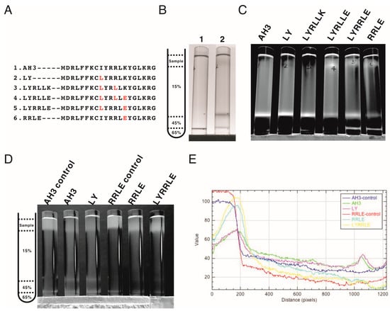 The co-sedimentation analysis of AH3–sfGFP–2xhM2e variants with bacterial membranes by analytic ultracentrifugation. (A) List of AH3 peptide variants introduced on the AH3–sfGFP–2xhM2e fusion protein for co-sedimentation analysis. (B) The right panel shows the graphic presentation of the centrifuge tube distribution of step sucrose solutions. The left panel shows the bacterial membrane distribution after ultracentrifugation, as marked by Sudan III staining. Lane 1 is a Sudan III solution only control without bacterial lysate, lane 2 is topped with 1 mL bacterial lysate mixed with Sudan III solution. The ratio between Sudan III staining solution and bacterial lysate is 1:100. (C) The distribution of sfGFP fusion proteins post ultracentrifugation as illuminated by 450 nm LED light was recorded as photos and analyzed by ImageJ. Only the green channel is shown. (D) The ability of purified protein nanoparticles to bind bacterial membranes was tested by first mixing with bacterial lysate and then analyzed by ultracentrifugation on a step sucrose gradient. The distribution of sucrose solutions of different percentages is shown in the left panel. The protein nanoparticles purified from fusion proteins containing various AH3 mutants AH3, LY, RRLE, and LYRRLE were tested. The control samples were not ultracentrifuged to reveal the original position of loaded samples. The photo taken is split into three channels by ImageJ; only the green channel is shown. (E) The combined line plot data showed the fluorescent intensity along the centrifuge tube from top to bottom. The image pixels had been averaged by the “smooth” command of imageJ before line plot analysis.