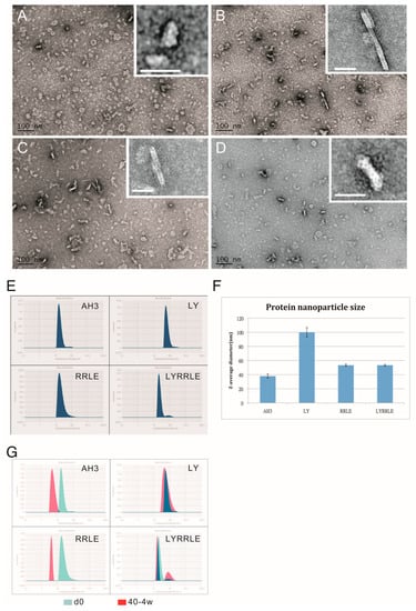 The TEM images of protein nanoparticles derived from AH3–sfGFP–2xhM2e and its variants. Purified protein nanoparticles were crosslinked with Sulfo-SMCC after buffer change from elution buffer using desalting resin (Sephadex 25). Protein samples were diluted to 0.1 mg/mL before being applied on the grid for TEM analysis. The representative images were presented in the sequence of (A) AH3–sfGFP–2xhM2e, (B) RRLD-sfGFP–2xhM2e, (C) RRLE–sfGFP–2xhM2e and (D) LYRRLE–sfGFP–2xhM2e. The enclosed window in the upper-right corner shows the magnified images of representative protein nanoparticles with size bar represent 20 nm. (E) The hydrodynamic diameter of protein nanoparticles derived from AH3–sfGFP–2xhM2e or its variant were analyzed by dynamic light scattering (DLS). (F) The Z average diameters of protein nanoparticles derived from AH3–sfGFP–2xhM2e or its variants were compared. (G) The merged hydrodynamic distribution graphs from protein nanoparticles prepared freshly or have been stored in 40 °C for 4 weeks.