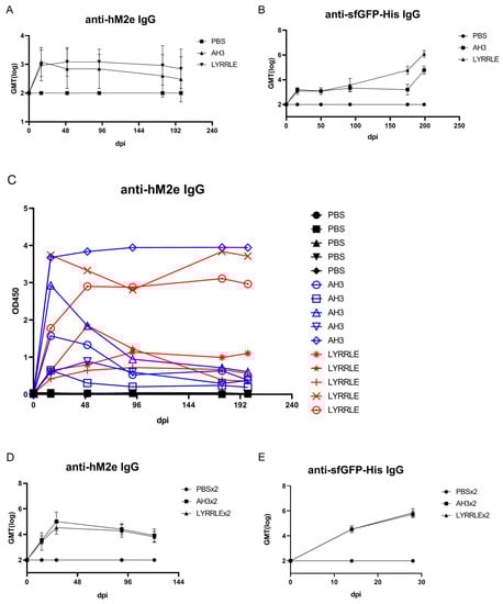 As shown in the sucrose step gradient ultracentrifugation, the presence of a hydrophobic patch enables nonspecific interaction of the AH3–GFP protein complex with the bacterial membrane, which may restrict the free movement of protein nanoparticles and keep them from reaching draining lymph nodes for stimulating immunity [6]. To compare the antigenicity of protein complexes derived from either AH3–sfGFP–2xhM2e or LYRRLE–sfGFP–2xhM2e, we immunized mice with a single injection of either recombinant protein. According to ImageJ analysis of SDS-PAGE gel, the purified protein nanoparticles had about 80% purity. Sera were collected on days 0, 16, 50, 92, 175, and 199 following immunization to evaluate anti-hM2e and anti-sfGFP–His IgG titer by ELISA (Figure 6A,B). The geometric mean titer of anti-hM2e IgG reached the highest point for the AH3–sfGFP–2xhM2e group and then declined afterward. However, in the LYRRLE–sfGFP–2xhM2e group, the GMT reached its highest point at day 50 and remained steady up to day 90. Surprisingly, the anti-sfGFP–His antibody did not decrease in the later stages but the IgG titer increased over time until the end of the experiment (Figure 6B). When the individual mouse serum results were observed separately, only one out of five mice from the AH3–sfGFP–2xhM2e group had a higher anti-hM2e IgG titer at day 199 than at day 16. However, four out of five mice from the LYRRLE–sfGFP–2xhM2e group showed a higher antibody titer on day 199 compared with day 16 (Figure 6C). These results suggest that the two point mutations of AH3 in I9L and K14E enabled the formation of a stable, high-antigenic protein complex that stimulates long-lasting immune responses in a single immunization.