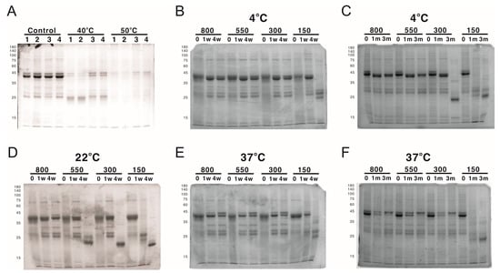 The analysis of protein nanoparticle stability using SDS-PAGE. The protein nanoparticle stability was analyzed by both SDS-PAGE and DLS. (A) Protein samples of 1) AH3–sfGFP–2xhM2e, 2) LY-sfGFP–2xhM2e, 3) RRLE–sfGFP–2xhM2e, or 4) LYRRLE–sfGFP–2xhM2e were incubated at either 40 °C or 50 °C for 4 weeks and analyzed in 12% SDS-PAGE for protein stability. LYRRLE–sfGFP–2xhM2e protein nanoparticles were first reconstituted in phosphate buffer containing 150 mM NaCl, and then the NaCl concentration was adjusted to either 300 mM, 550 mM, or 800 mM before being stored in 4 °C (B,C), 25 °C (D), or 37 °C (E,F) for the period of time indicated. Protein samples were removed and processed, and then stored before being analyzed by SDS-PAGE.