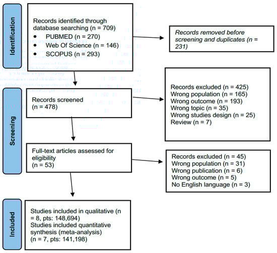 The initial search resulted in 709 relevant studies among all three databases (Pubmed, Web of Science and Scopus). After duplicate removal (231 duplicates articles), the initial search resulted in 478 eligible papers. With the exclusion of 425 papers after screening the abstracts, full texts of 53 articles were reviewed. Subsequently 45 were excluded. Figure 1 shows the complete article selection process. All eight studies [,,,,,,,] were cohort studies and had a low risk of bias assessed by the Newcastle–Ottawa Scale, and all were assessed to have at least adequate methodological quality (score ≥ 6). Seven were retrospective studies [,,,,,,], and one was a cross sectional study []. Eight studies were included for qualitative synthesis (Table 1). Seven studies were included for quantitative synthesis. Among the eight studies, four (50%) examined the vaccination adherence in young adults through data registered in nationwide, insurance, or private companies’ databases [,,,], three (37.5%) in young adults in different settings through data collected from surveys and questionnaires [,,], one (12.5%) an HPV vaccination campaign in a family medicine residency practice []. All the studies were conducted in the United States of America (USA). The total number of patients considered was 147,465. Hubbard et al. [] analyzed data of 134,867 (90%). One study reported data of 6267 (4.2%) patients [], one study reported data of 3591 (2.4%) patients [], one study had a sample size of 1849 (2%) patients [], and four studies had a sample of less than 600 (1%) patients [,,,].