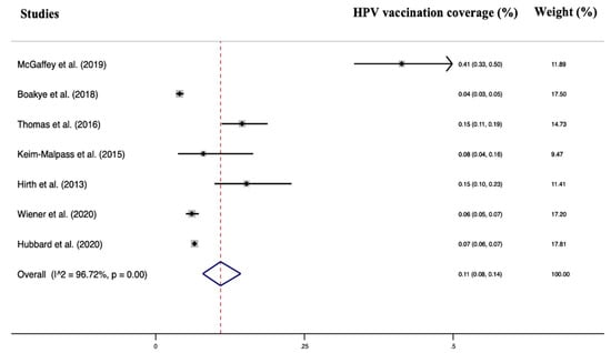 Srivastav et al. [] analyzed combined data from 2013–2015 National Health Interview Survey, a nationally representative probability-based health survey of the non-institutionalized U.S. population ≥ 18 years for vaccination coverage. Among 101,091 patients, 6267 (9.5%) received at least 1 vaccine for HPV. This study does not differentiate between participants vaccinated with one, two, or three doses; therefore, it was not possible to determinate how many participants received full vaccination against HPV. Due to this, the study was excluded from the quantitative synthesis (meta-analysis).