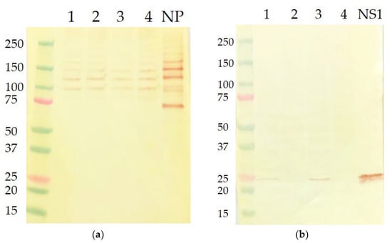 Since NS1 protein is not usually found in viral particles, we analyzed NS1 protein expression in MDCK cells infected with the studied viruses. The cells were infected with each of the four viruses at MOI 0.01, and the productive infection was confirmed by the detection of equal levels of NP expression for each studied virus (Figure 2a). Interestingly, the NP bands, both for cell lysates and the recombinant protein, could be detected by the A/NP/6D11 universal antibody only under non-reducing conditions, suggesting that the monoclonal antibody binds to the polymeric forms of NP and fails to bind thermo-dissociated NP monomeric subunits—a phenomenon previously reported for similar monoclonal anti-NP antibody N5D3 [].