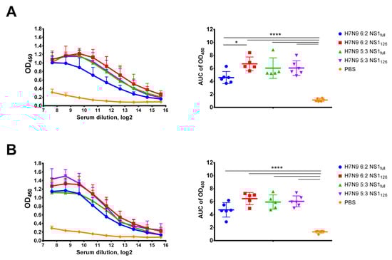 Serum IgG antibody levels to the whole H7N9 6:2 and H7N9 5:3 LAIV viruses were detected using enzyme-linked immunosorbent assay (ELISA) as previously described []. For this, high-binding 96-well plates (Corning, Glendale, AZ, USA) were coated with 50 ng/well of sucrose gradient purified whole influenza viruses in a carbonate-bicarbonate buffer at 4 °C overnight. After blocking with 5% skimmed milk for 1 h at 37 °C and washing 3 times with PBS-T, two-fold serum dilutions starting from 1:200 were added and the plates were incubated for 1 h at 37 °C. At the next step, washed plates were treated with goat anti-mouse antibody conjugated with HRP (BioRad, Hercules, CA, USA). The plates were developed using 1-Step Ultra TMB-ELISA Substrate Solution (Thermo Fisher Scientific, Waltham, MA, USA). After 15 min incubation at room temperature, the reaction was stopped by adding 1M H2SO4. The absorbance was measured at 450 nm using an xMark Microplate Spectrophotometer (BioRad, USA). Antibody levels were expressed as the area under the curve (AUC) of OD450 values for serum 2-fold dilutions from 1:200 to 1:51,200, using the trapezoidal rule.