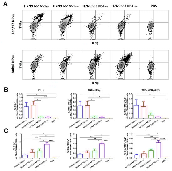 LAIV reassortant viruses induced robust cytotoxic T lymphocyte (CTL) responses, as was determined by stimulating mouse splenocytes collected on the day after the booster immunization with immunodominant NP366 peptide. Importantly, only LAIVs with a 6:2 genome composition could induce significant levels of CD8+ memory T cells specific to the Len/17 NP366 epitope (Figure 4A,B). Remarkably, these virus-specific T cells were polyfunctional and secreted all three cytokines. Interestingly, when the NP from Len/17 was replaced by the NP of Anhui (H7N9) virus (i.e., LAIV viruses with 5:3 genome composition), dramatically reduced levels of Len/17 peptide-specific cells were observed after immunization (Figure 4A,B).