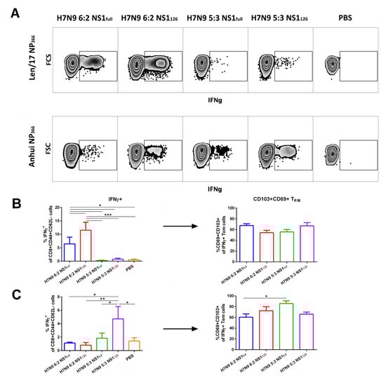 Importantly, in our study, we observed a clear enhancement of adaptive virus-specific CD8 T-cell responses after intranasal immunization with NS1-modified LAIVS, which was particularly notable in the detection of lung-localized CD8 memory T cells: both 6:2 and 5:3 NS1-modified candidates had significantly better responses to the corresponding NP epitope than their counterparts. We also showed that the majority of the NP366-specific Tem cells in the lungs possessed resident memory phenotype (CD69+CD103+), which are assumed to be at the first line of defense against invading respiratory pathogens []. Therefore, it is critical that the specificity of TRM cells match the currently circulating viruses; otherwise these CTLs will not be able to recognize cells infected with the virus. The results of the present study support the idea of switching from a 6:2 to 5:3 LAIV genome formula to induce a CTL response more appropriate to the current infection. Furthermore, to increase the magnitude of the induced CTL response, truncation of the NS1 protein is a very promising strategy.