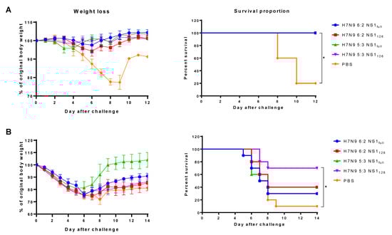 Protection of immunized mice against two different doses of heterosubtypic lethal virus. Mice were immunized with two doses of indicated H7N9 LAIV viruses or PBS and challenged with 106 EID50 (A) or 107 EID50 (B) of the PR8 7:1 (NP/H7N9) challenge virus. Weight loss (left panel) and survival rates (right panel) were monitored for two weeks post-challenge. Survival rates were compared by Mantel–Cox log-rank test. * p < 0.05.