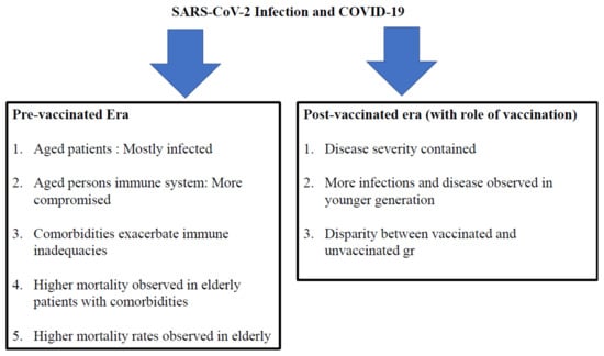 The immune systems of aged persons are more susceptible to infection. A higher rate of infections was observed in elderly populations (especially care facilities), and comorbidities exacerbated immune inadequacies. As a result, there were higher mortality rates observed in the elderly. As mentioned previously, the healthcare delivery system, national strategy to contain COVID-19, capabilities of the medical facilities to fight COVID-19, and socioeconomic conditions play essential roles in the containment of COVID-19. However, host immunity is one of the main determinants. Epidemiological analysis regarding the nature of SARS-CoV-2-infected patients in the pre-vaccinated era revealed that over the initial 12–16 months of the pandemic, most of the patients with severe COVID-19 were either aged people or people with comorbidities [,,,,,,]. In other words, this population was somehow immune-compromised. There are undoubtedly several different causes underlying these findings. However, the general picture is more or less acceptable.