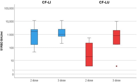 The median S1RBD antibody level after dose two in CF-LI was 3124.2 BAU/mL (range 46–11,360) compared to 105 BAU/mL (range <3–551.9) in CF-LU. After dose three, the median S1RBD antibody level in CF-LI was 3158.1 BAU/mL (range 209.4–11,360) compared to 2000 BAU/mL (range <3–9815.2) in CF-LU. Changes in S1RBD antibodies are shown in Figure 1.