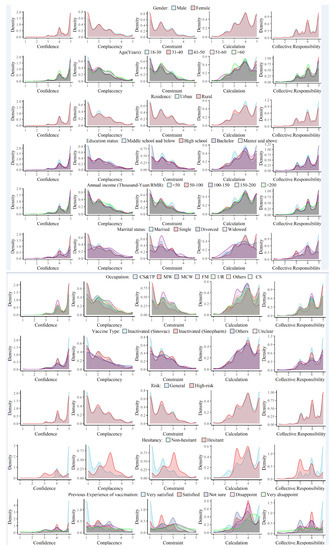 Probability density functions of each 5C subscale score in gender, age groups, residence, education status, annual income, marital status, occupation, risk of COVID-19, primary vaccine type and previous vaccination experience of primary doses of 4039 respondents. CS&TP: civil servant and technical personnel; MW: medical workers; MCW: manufacturing and commercial workers; FM: farmers/herders/fishermen; UR: unemployed/retirees; CS: college students.