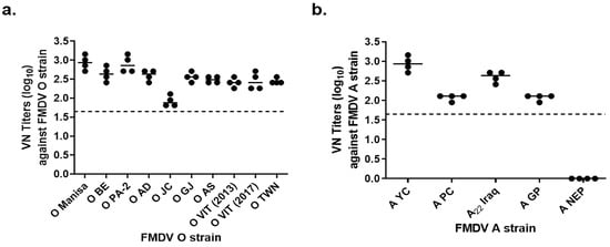 Neutralizing antibodies against various FMDV strains induced in intradermally vaccinated swine. The test vaccine was administered to swine at 15 µg O PA-2 + A22 Iraq antigen, ISA207 (oil-based emulsion, 50%, W/O/W), 10% Al(OH)3, and 1% Saponin. (a) Viral Neutralization (VN) titers against FMDV O strains; (b) VN titers against FMDV A strains.