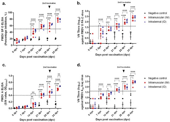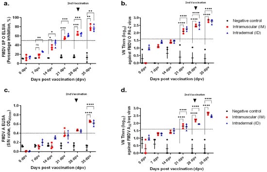 Comparison of serological response after vaccination of guinea pigs with ID and IM vaccine. The test vaccine was administered to guinea pigs at one-tenth dose of O PA-2 + A22 Iraq antigen for pig use, ISA207 (oil-based emulsion, 50%, W/O/W), 10% Al(OH)3, and 1% Saponin. The negative control group was administered the test without vaccine. The IM group was inoculated with 0.2 mL/dose of vaccine and ID group was inoculated with 0.05 mL/dose of vaccine. Serum sampled from guinea pigs at 0, 7, 14, 21, 28, and 35 dpv was analyzed via SP antibody ELISA and VN assay. (a) Percentage inhibition (PI) value of FMDV type O SP ELISA in individuals (The dashed lines are positive value.). (b) VN titers against the FMDV O PA 2 strain. (c) Percentage inhibition (PI) value of FMDV type A SP ELISA in individuals (The dashed lines are positive value.). (d) VN titers against FMDV A22 Iraq strain. The dotted lines in SP-ELISA results indicate 50% inhibition, the positive threshold in the test. The dotted lines in VN test show 1.65 log VN titers. IM: intramuscular injection; ID: intradermal injection; the datasheets are the mean ± SEM; statistical analyses were performed using two-way ANOVA; ns; *, p < 0.05; **, p < 0.01; ***, p < 0.001; and ****, p < 0.0001.