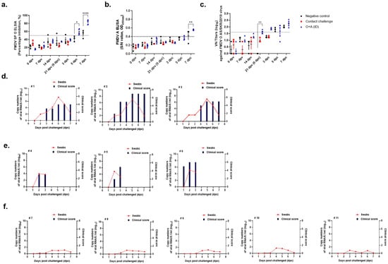 Of the five swine in the ID vaccinated group, one individual showed sporadic viremia lasting 3 dpc, with virus copy numbers (log 10) ranging from 0.115 to 1.215. The virus copy number (log 10) was 3.256–5.152 in the contact infection group. Individuals in the contact infection group were sacrificed after 3 dpc. In the negative control group, viral RNA was detectable for 2–7 dpc, with viral copy numbers (log 10) ranging from 1.752 to 7.256 (Figure 4d).