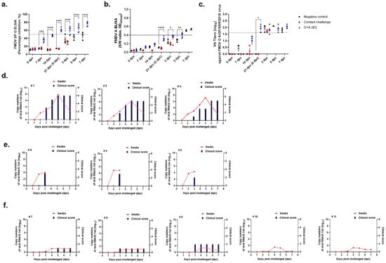 Clinical scores and FMDV RNA levels in swine immunized and VN titer after contact infection with donor swine inoculated with the O/AS/SKR/2019 strain. After vaccination, the swine were challenged with the O/AS/SKR/2019 strain. FMDV RNA levels in nasal swabs were measured by qRT-PCR from 0 to 7 days after challenge. Serum samples from the swine at 0, 7, 14, and 21 dpv, and 0, 3, 5, and 7 dpc were analyzed via VN assay. (a) Percentage inhibition (PI) value of FMDV type O SP ELISA in individuals. (b) Percentage inhibition (PI) value of FMDV type A SP ELISA in individuals. (c) VN titers against O/AS/SKR/2019 strain. (d) The clinical scores and FMDV RNA levels in negative group. (e) The clinical scores and FMDV RNA levels in contact infection group. (f) The clinical scores and FMD virus RNA levels in ID vaccination group. ID: intradermal injection; the datasheets are the mean ± SEM; statistical analyses were performed using two-way ANOVA; *, p < 0.05; **, p < 0.01; ***, p < 0.001; and ****, p < 0.0001.