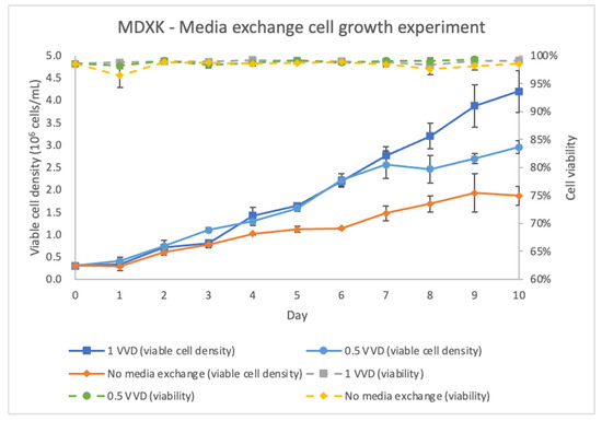 Viable cell density and cell viability in shake flasks with a media exchange at 0–1 vessel volume per day (VVD).