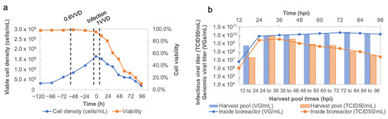 (a) Viable cell density and cell viability curves in cell growth and rVSV-SARS-CoV-2 production in the perfusion bioreactor. (b) Infectious viral titer and genomic viral titer of rVSV-SARS-CoV-2 production in the perfusion bioreactor and the harvest pool.