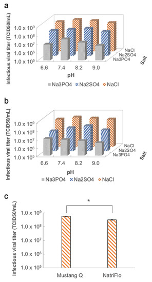 To determine the optimal purification conditions, a two-level full factorial design of the experiment was performed (Figure 5). When assembling Mustang Q to the AKTA, results show that the salts impacted the infectious titers of rVSV-SARS-CoV-2 significantly, with decreasing trend of around one order of magnitude from NaCl to Na3PO4 (Figure 5a). Among all the combinations, the elution buffer containing NaCl at a pH of 7.4 shows the best performance for purifying rVSV-SARS-CoV-2 with the infectious viral titer of 5.62 ± 0.33 × 108 TCID50/mL. Similarly, another anion exchange chromatographic membrane NatriFlo HD Q was selected to compare with the Mustang Q (Figure 5b). Results show that the overall infectious viral titers of rVSV-SARS-CoV-2 purified by NatriFlo HD Q were lower than those purified by Mustang Q. The infectious titer peaked at 3.16 ± 0.24 × 108 TCID50/mL, with the best condition being a pH of 7.4 in a NaCl buffer. The DoE reveals that the NaCl buffer with pH of 7.4 when using Mustang Q is the optimal purification condition. A statistically significant difference in the infectious viral titer between using Mustang Q and NatriFlo membranes was observed, as determined by a t-test (p < 0.05) (Figure 5c).