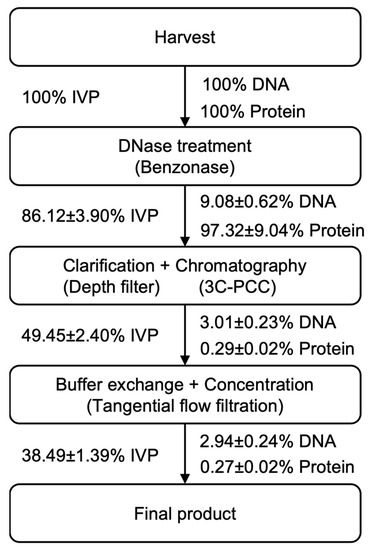 The schematic of the downstream process, infectious viral titer recovery, as well as for the DNA and protein removal.