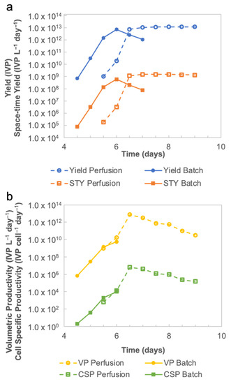 In an upstream process, there are various descriptions that are used when comparing the productivity of batch and perfusion modes; for example, yield, space–time yield (STY), volumetric productivity (VP), and cell-specific productivity (CSP) [21]. Yield is defined as the total accumulated infectious viral particles (IVP) since process start. For the batch mode, yield equals the infectious viral titer multiplied by the working volume of the bioreactor: