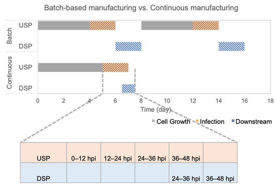 Comparison of the processing time of batch-based manufacturing and continuous manufacturing in the production of rVSV-SARS-CoV-2 in cell cultures, infection phases, and downstream processing.