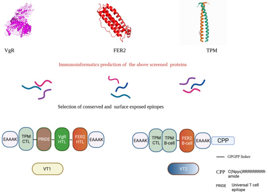 Schematic diagram of multi-epitopic peptide construct (created with biorender.com (accessed on 1 April 2022)). The VT1 contains TPM CTL epitope (KIVELEEEL), VitR HTL epitope (YGEPFLLYMLPNQIR), and FER2 HTL epitope (DTGLGEFLLDQQLRT) as indicated. The VT2 contains TPM CTL (KIVELEEEL), TPM B-cell epitope (LEEELRVVGNNLKSL), and one FER2 B-cell epitope (DFLEQEFLAEQVKSID) linked with GPGPG linker.