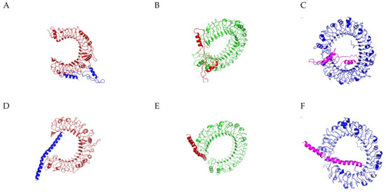 (A–F) Docked complexes of TLR-2, TLR-4, and TLR-9 with VT1 (A–C) and VT2 (D–F) peptides.