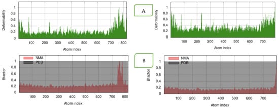 The VT1 and VT2 constructs with TLR-9 produced a reliably stable simulation, as shown by normal mode analysis (NMA). The simulation study was conducted to specify the motions of molecules and atoms in the construct. The deformability graph of the complex depicts peaks in the graphs, which characterizes the regions of the protein with deformability (Figure 5A). The B-factor values derived by normal mode analysis are proportional to root mean square and they measure the uncertainty of each atom (Figure 5B). The B-factor value and root mean square deviation (RMSD) per residue amino acid showed more flexible residues with a sharp peak (Figure 6A,B) using MDWEB server. Better protein stability is indicated by a lower RMSD value, and the acceptable range for RMSD is between 0 and 1.2. The RMSD value for both VT1 and VT2 were in the range.