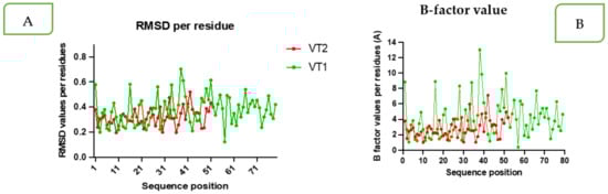 RMSD per residue (A) and B-factor value (B) per amino acid showing more flexible residues with the sharp peak (red for VT2 and green for VT1).