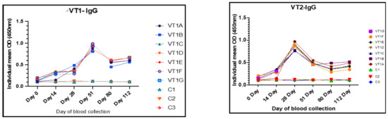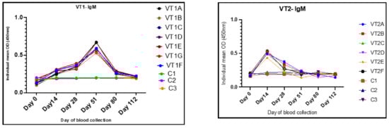 After three inoculations of two concentrations of VT1 and VT2, ELISA was conducted as mentioned above, employing optimized conditions. The blood was collected from day 0 to day 112 post-immunization (DPI), sera were separated and processed for monitoring IgG and IgM responses at different time points. The mean optical density was calculated at each point in individual immunized and control groups of rabbits and analyzed statistically.