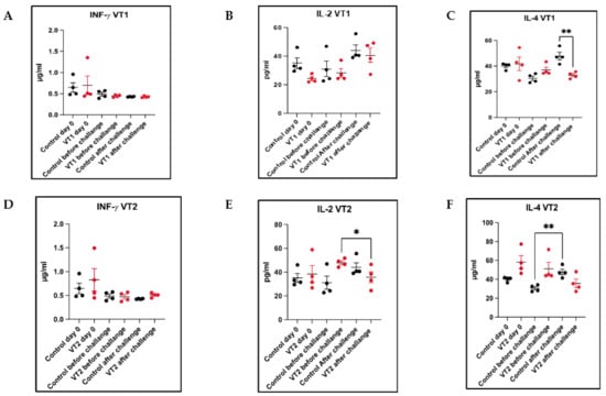 The importance of inducing both HI and CMI responses in conferring immunity against challenge infestations/infection is well documented [50]. Likewise, in this study, MEPs were designed to target both the CMI and HI responses. In the post-challenge period, a significant (p < 0.001) reduction in the anti-inflammatory cytokine (IL-4) expression was observed in the VT1- and VT2-immunized group of rabbits as compared with the response observed in the control group of rabbits. This finding was contradictory to the results obtained by Sajid and co-workers [50], where anincreased IL-4 level was reported in the immunized group as compared with the control group of animals. The down regulation of the Th1 cytokines IL-2 and IFN- γ and the up-regulation of the Th2 cytokines IL-4, IL-5, IL-6, and IL-10 during infestation is a common feature for many tick-host relationships [56,57,58]. A significant up-regulation of Th1 cytokines INF-γandIL-2 and down-regulation of Th2 cytokine IL-5 wasrecorded in the VT2-immunized group after 48 h of larval challenge. However, up-regulation of IL-2 and down-regulation of theTh2 cytokine IL-5 wasrecorded in the VT1-immunized group after 48 h of larval challenge. Similar results were demonstrated by Sajidet al. [50], where pro-inflammatory cytokine expression was enhanced in the 19ISP-based mRNA vaccine. It enhanced the recognition of tick bites and reduced I. Scapularis engorgement and prevented transmission of Lyme disease. Another peptide-based vaccine against mosquito has already been under phase 1 trial on49 healthy human volunteers. The salivary protein A. gambiae (AGS-v) has been reported to producea significant IgG antibody response in addition to a significant increase in INF-γ levels expression by the PBMCs at 42 DPI [72].
