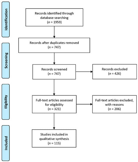 The final search yielded 1959 articles, which were reduced to 747 articles after removing duplicate articles. Using the inclusion criteria, the lead author conducted a title/abstract screening of all 747 unique articles, of which 321 articles were eligible for full-text review. After the full-text review, a total of 115 articles met the inclusion criteria and were included in the qualitative synthesis (see Figure 1 for the PRISMA diagram). For simplicity in reporting the results, the term “parents” includes parents, guardians, or caregivers.