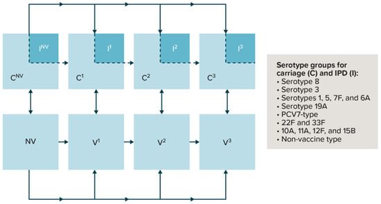 Many cost-effectiveness models have been developed to assess the impact of PCVs in the UK [11,12,13]. Dynamic transmission models (DTMs) are well suited for modeling pneumococcal disease. DTMs capture both the direct and indirect effects of disease propagation, and they allow an estimate of the predictive behavior of the disease. Previous DTMs have modeled PCV13 versus PCV7 and PCV13 in different dosing schedules [7,12,14].