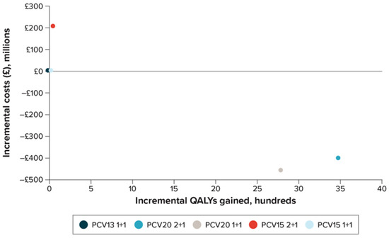 Figure 2 presents the incremental cost-effectiveness plane for the evaluated schedules. Both PCV20 programs were found to be dominant (less costly and more effective) compared with the PCV15 and the PCV13 1+1 programs. PCV15 2+1 was more effective and more costly than PCV13 1+1 but was not cost-effective (incremental cost-effectiveness ratio [ICER] of over GBP 300,000 per QALY gained). PCV15 1+1 was cost-effective compared with PCV13 1+1 (at an ICER of GBP 3112 per QALY gained). PCV20 programs dominated PCV15 programs by being more effective and less costly than PCV15. Finally, compared with a PCV20 1+1 program, a PCV20 2+1 program was cost-effective, with an ICER of GBP 12,001/QALY gained (an NMB of GBP 82,199,578), which is well under the cost-effectiveness threshold range in the UK.