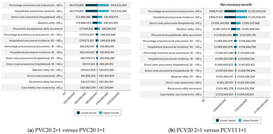 One-way sensitivity analyses comparing PCV20 2+1 versus PCV20 1+1 and PCV13 1+1 are displayed in Figure 3. The top three most influential parameters in both comparisons were the percentage of pneumonia cases that are pneumococcal (individuals aged ≥65 years), the hospitalized pneumonia incidence (individuals aged ≥65 years), and the direct costs for hospitalized pneumonia (individuals aged ≥65 years). The NMB of PCV20 2+1 versus PCV20 1+1 was GBP 82,135,034, and the NMB did not fall below roughly GBP 61,000,000. For the comparison of PCV20 2+1 versus PCV13 1+1, the NMB was substantially more (about GBP 1 billion), and the NMB did not vary markedly from this estimate.