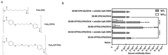 Adjuvant potential of polyanhydrides. (A) Chemical structures of different polyanhydrides, (B) their adjuvant potential with Ovalbumin (Ova) antigen and CpG adjuvant in mice. Mean values ± SD were plotted in the presented graph. * p < 0.05, *** p < 0.001. Figure reproduced with permission from [22].