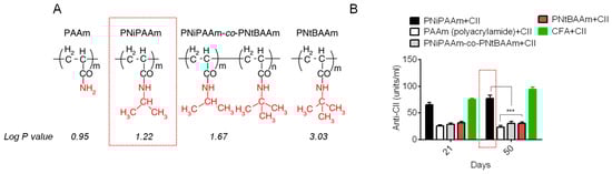 Adjuvant potential of polyamides. (A) Chemical structures of amine-containing polymers with increasing hydrophobic properties, (B) anti-CII response in mice serum injected with different polymers mixed with CII. Mean values ± SD were plotted in presented graph data are plotted in form of mean, *** p < 0.001. figure, reproduced with permission from [5].