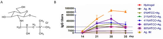 The adjuvant potential of positively charged polymer. (A) Chemical structures of modified 2-hydroxypropyl trimethyl ammonium chloride chitosan (HTCC), (B) its adjuvant potential in different proportions with H5N1 vaccine in mice. Figure reproduced with permission from [28].