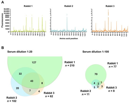 As expected for the inter-individual polyclonal antibody responses, the animals had different serum antibody binding profiles (Figure 2A). At a serum dilution of 1:20, Rabbits 1, 2, and 3 targeted 210, 102, and 62 individual peptides, respectively. At a 5-fold higher serum dilution of 1:100, the three rabbits had fewer positive peptide detections at 77, 11, and 8, respectively. For both serum dilutions, Rabbit 2 and Rabbit 3, which had an intermediate and high cross-neutralization against the VOCs, targeted significantly fewer peptides and had distinct peptides in common (Figure 2B).