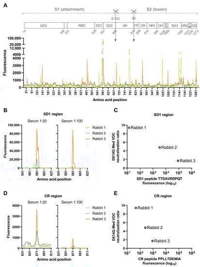 Dominant antibody binding to an SD1 epitope in animals with cross-neutralization of the VOCs. (A) Comparative serum antibody binding for the three animals relative to the different SARS-CoV-2 spike protein domains. S1 subunit (residues 14–685); S2 subunit (residues 686–1273); N-terminal domain (NTD); receptor binding domain (RBD); sub-domain 1, 2, 3 (SD1, SD2, SD3), S1/S2 furin cleavage site; upstream helix (UH); S2’ cleavage site; fusion peptide (FP); connecting region (CR); heptad repeat sequence 1 and 2 (HR1, HR2); central helix (CH); connector domain (CD); transmembrane helix (TM); and connector domain (CD). Antibody binding with a sample dilution of 1:20 and 1:100 to the SD1 region (B) and correlation analysis of antibody binding to the peptide TTDAVRDPQT (amino acids 572–581 on the index strain) to cross-neutralization capacity of the VOCs (C). Antibody binding with a sample dilution of 1:20 and 1:100 to the CR region (D) and correlation analysis of antibody binding to the peptide PPLLTDEMIA (amino acids 862–871 on the index strain) to cross-neutralization capacity of the VOCs (E). Antibody binding is expressed as fluorescence intensity measured for the duplicate spots of the peptide. Cross-neutralization capacity is calculated as the ratio of neutralization titers determined for the D614G strain to the median of neutralization titers of the VOCs (Med VOC).