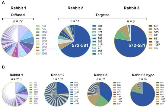 Proportionate binding of serum IgG to overlapping peptides spanning the SARS-CoV-2 index strain spike ectodomain for each rabbit. The pie charts consider the level of antibody binding, expressed as relative fluorescent units, to each peptide as a proportion of the sum of relative fluorescent units measured for binding to all overlapping peptides. (A) At a serum dilution of 1:100, Rabbit 2 and Rabbit 3 show dominant, targeted binding to the peptide spanning residues 572–581 (TTDAVRDPQT), while Rabbit 1 lacks binding to this peptide and show a more diffuse antibody binding profile. (B) At a serum dilution of 1:20, the dominance of peptide 572–581 remains for Rabbit 2 and Rabbit 3. Rabbit 3 hypo is the hypothetical proportion with no limiting spot saturation.
